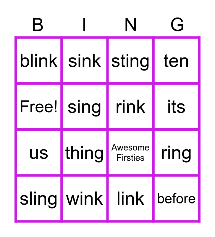 This bingo card has 16 words: wink, ring, sting, blink, us, sink, Awesome Firsties, link, Free!, sing, sling, ten, thing, its, rink and before.