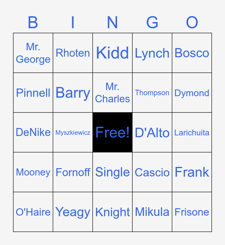 This bingo card has a free space and 34 words: Basler, Price, Stuart, Winaker, Larichuita, Pinnell, Barry, Knight, Thompson, Frisone, DeNike, Rhoten, Mikula, McEwan, Mooney, Myszkiewicz, Single, D'Alto, Frank, O'Haire, Yeagy, Hyde, Lynch, Dymond, Robertson, Fornoff, Kidd, Prem, Bosco, Mr. George, Ms. Brenda, Mr. Charles, Cascio and Parks.