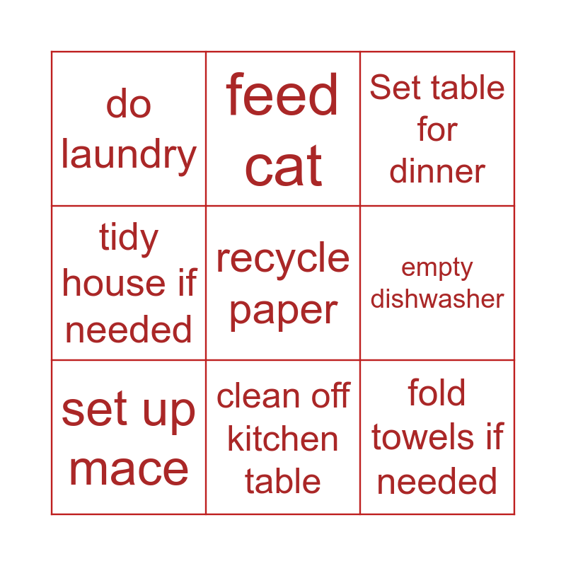 This bingo card has a free space and 8 words: empty dishwasher, Set table for dinner, feed cat, set up mace, do laundry, fold towels if needed, tidy house if needed and clean off kitchen table.