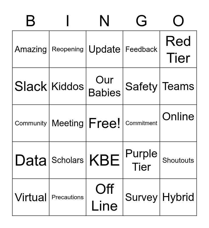 This bingo card has a free space and 28 words: Shoutouts, Norming, Safety, Survey, Slack, Update, Reopening, Data, Commitment, Virtual, Community, Feedback, Precautions, Off Line, Teams, Values, Scholars, Kiddos, Our Babies, KBE, Amazing, Chat Box, Hybrid, Meeting, Online, Purple Tier, Red Tier and Breakout Room.