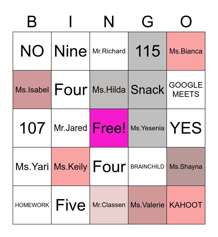 This bingo card has a free space and 24 words: Ms.Keily, Five, Ms.Hilda, HOMEWORK, Ms.Bianca, NO, Ms.Isabel, Nine, Ms.Yesenia, Four, Snack, 107, BRAINCHILD, Ms.Shayna, Four, Ms.Valerie, YES, Mr.Richard, GOOGLE MEETS, Mr.Jared, KAHOOT, Ms.Yari, 115 and Mr.Classen.