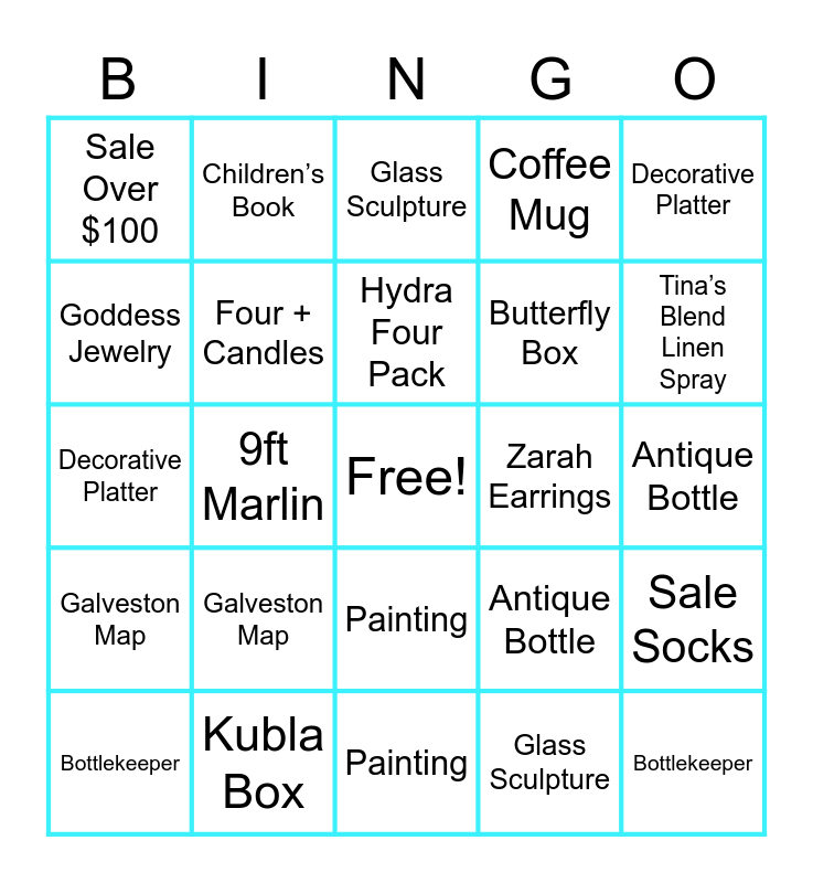 This bingo card has a free space and 49 words: Tina’s Blend Linen Spray, Bottlekeeper, Puzzle, Painting, Galveston Map, Stuffed Turtle, Children’s Book, Glass Eye Paperweight, Goddess Jewelry, Kubla Box, Four + Candles, Coffee Mug, Sale Socks, Antique Bottle, Himalayan Candle, Goverre, Hydra Four Pack, Zarah Earrings, Swiss Army Knife, Decorative Platter, 9ft Marlin, Glass Sculpture, Sale Over $100, Butterfly Box, Blanket, Tina’s Blend Linen Spray, Bottlekeeper, Puzzle, Painting, Galveston Map, Stuffed Turtle, Galveston Book, Glass Eye Paperweight, Goddess Jewelry, Kubla Box, Four + Candles, Coffee Mug, Sale Socks, Antique Bottle, Himalayan Candle, Goverre, Hydra Four Pack, Zarah Earrings, Swiss Army Knife, Decorative Platter, Glass Sculpture, Sale Over $100, Butterfly Box and Blanket.