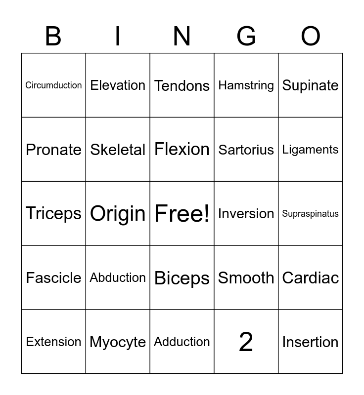This bingo card has a free space and 25 words: Abduction, Adduction, Flexion, Extension, Supinate, Circumduction, Pronate, Elevation, Inversion, Biceps, Sartorius, Triceps, Smooth, Cardiac, Skeletal, Branched, Supraspinatus, Tendons, Ligaments, Origin, Insertion, Myocyte, Fascicle, Hamstring and 2.