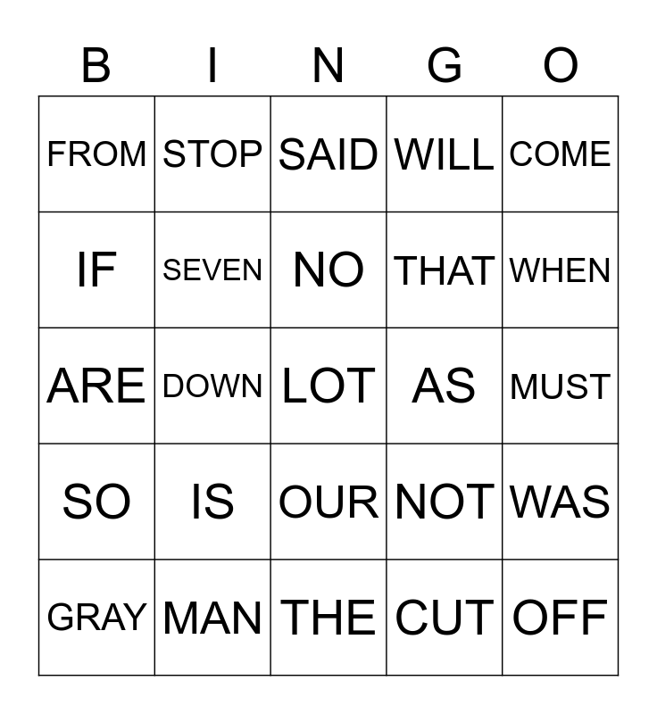 This bingo card has a free space and 24 words: IS, MAN, NO, GRAY, COME, FROM, IF, STOP, AS, OUR, THAT, ARE, NOT, WAS, SEVEN, CUT, MUST, SAID, WHEN, DOWN, OFF, SO, WILL and THE.