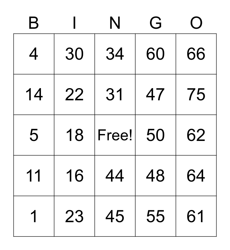 This bingo card has a free space and 24 words: 1, 16, 31, 55, 66, 4, 30, 34, 50, 62, 5, 22, 48, 64, 14, 23, 45, 60, 75, 11, 18, 44, 47 and 61.