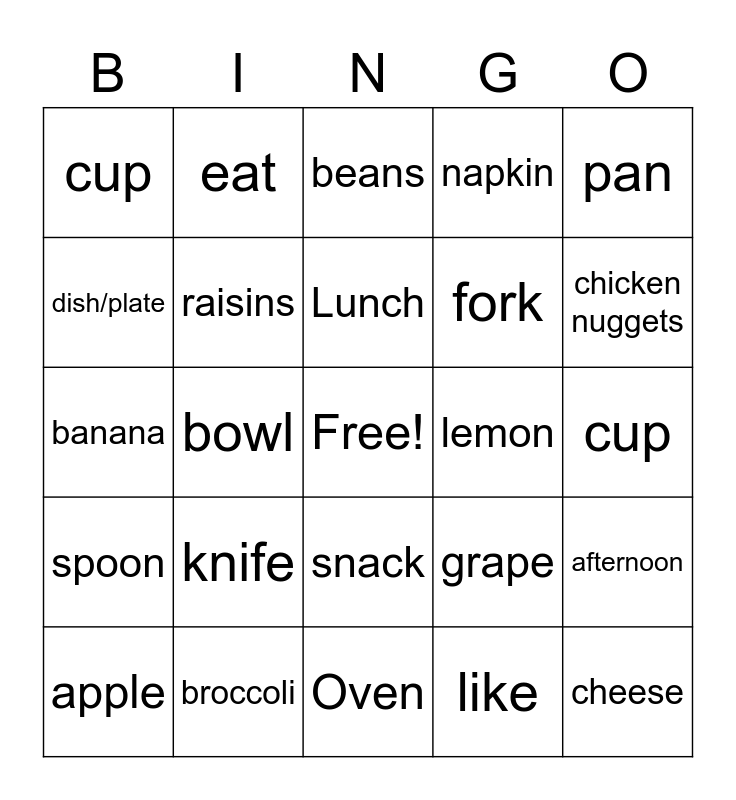 This bingo card has a free space and 67 words: day, morning, noon, afternoon, night, midnight, eat, Breakfast, Lunch, Dinner/Supper, snack, drink, cup, pan, pot, dish/plate, bowl, cup, glass, fork, knife, spoon, napkin, like, don’t Like, yes, no, meat, chicken nuggets, hamburger, cheese, hotdog, turkey, fruit, orange, apple, strawberry, grape, banana, blueberry, cherry, raisins, lemon, pickle, vegetable, carrot, celery, broccoli, peas, corn, beans, refrigerator, dishwasher, microwave, Sink, Oven, Cabinet, Table, Chair, Cold, hot, hungry, full, more, finished, full and empty.