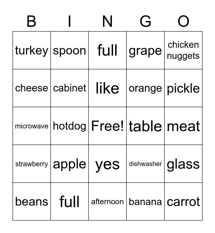 This bingo card has a free space and 67 words: dish/plate, bowl, cup, glass, fork, knife, spoon, napkin, like, don’t Like, yes, no, meat, chicken nuggets, hamburger, cheese, hotdog, turkey, fruit, orange, apple, strawberry, grape, banana, blueberry, cherry, raisins, lemon, pickle, vegetable, carrot, celery, broccoli, peas, corn, beans, refrigerator, dishwasher, microwave, sink, oven, cabinet, table, chair, cold, hot, hungry, full, more, finished, full, empty, day, morning, noon, afternoon, night, midnight, eat, Breakfast, Lunch, Dinner/Supper, snack, drink, cup, pan and pot.