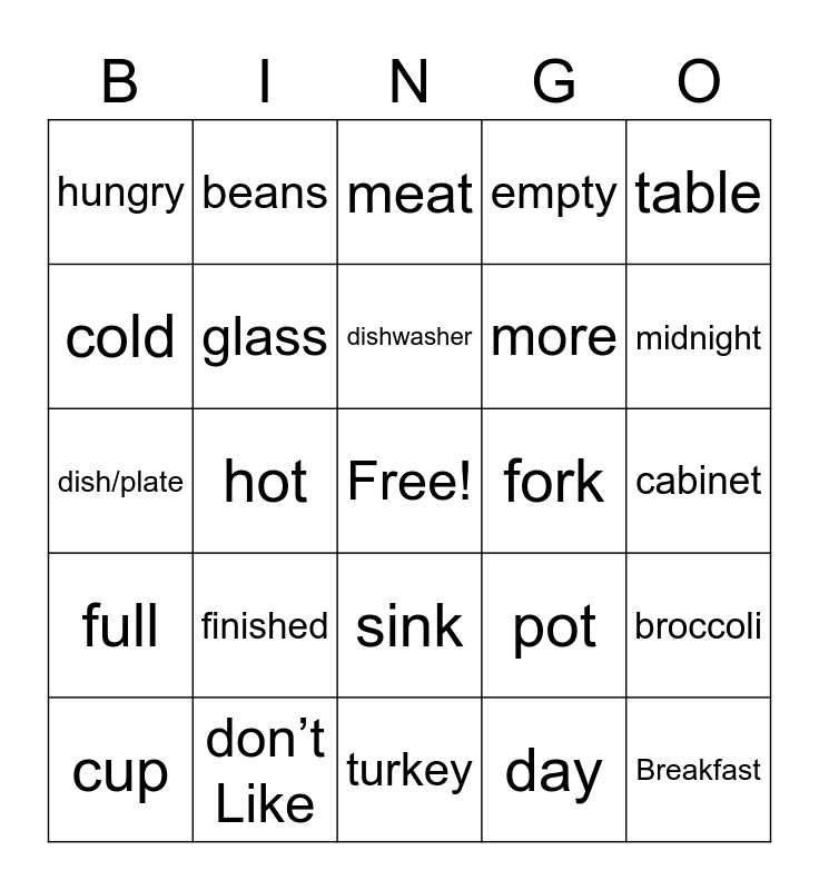 This bingo card has a free space and 67 words: vegetable, carrot, celery, broccoli, peas, corn, beans, refrigerator, dishwasher, microwave, sink, oven, cabinet, table, chair, cold, hot, hungry, full, more, finished, full, empty, day, morning, noon, afternoon, night, midnight, eat, Breakfast, Lunch, Dinner/Supper, snack, drink, cup, pan, pot, dish/plate, bowl, cup, glass, fork, knife, spoon, napkin, like, don’t Like, yes, no, meat, chicken nuggets, hamburger, cheese, hotdog, turkey, fruit, orange, apple, strawberry, grape, banana, blueberry, cherry, raisins, lemon and pickle.