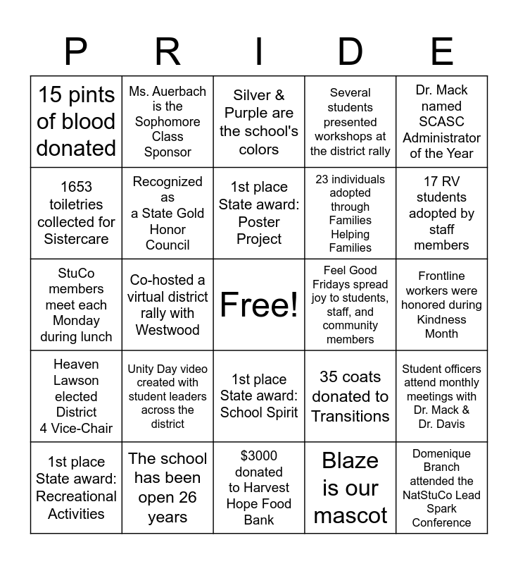 This bingo card has a free space and 39 words: StuCo is the nickname given to Student Council, 68 members of StuCo, 53 clubs and organizations, Recognized as a State Gold Honor Council, 1st place State award: Recreational Activities, 1st place State award: School Spirit, 1st place State award: Poster Project, 3rd place State award: Community Service, Dr. Mack named SCASC Administrator of the Year, Heaven Lawson elected District 4 Vice-Chair, Co-hosted a virtual district rally with Westwood, Several students presented workshops at the district rally, Domenique Branch attended the NatStuCo Lead Spark Conference, Frontline workers were honored during Kindness Month, Feel Good Fridays spread joy to students, staff, and community members, Unity Day video created with student leaders across the district, Homecoming contestants raised over $7000 for Make-A-Wish, 15 pints of blood donated, Winter Wishes is our school wide service project, 35 coats donated to Transitions, 1653 toiletries collected for Sistercare, $3000 donated to Harvest Hope Food Bank, 23 individuals adopted through Families Helping Families, 17 RV students adopted by staff members, 342 dog toys created during Service Saturday, Yazmine Lattimore is the Student Body President, Mr. Soderstrom is the Senior Class Sponsor, Ms. Bovidge is the Junior Class Sponsor, Ms. T. Smith is the Freshman Class Sponsor, Ms. Auerbach is the Sophomore Class Sponsor, Ms. Fennell is the Student Activities Director, Student Activities is located in M-141, Silver & Purple are the school's colors, The school has been open 26 years, Blaze is our mascot, Need butcher paper? Come to Student Activities!, Student officers attend monthly meetings with Dr. Mack & Dr. Davis, StuCo members meet each Monday during lunch and The Executive Board meets each Friday at 8 AM.