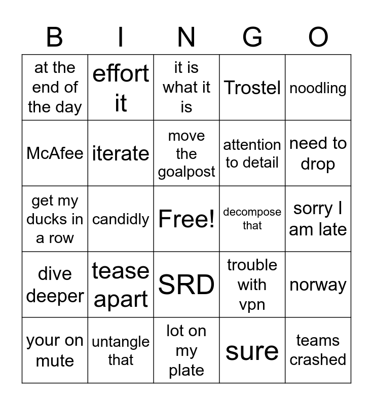 This bingo card has a free space and 24 words: tease apart, untangle that, move the goalpost, your on mute, noodling, at the end of the day, McAfee, effort it, decompose that, SRD, attention to detail, get my ducks in a row, trouble with vpn, norway, iterate, sure, sorry I am late, it is what it is, need to drop, candidly, teams crashed, dive deeper, Trostel and lot on my plate.