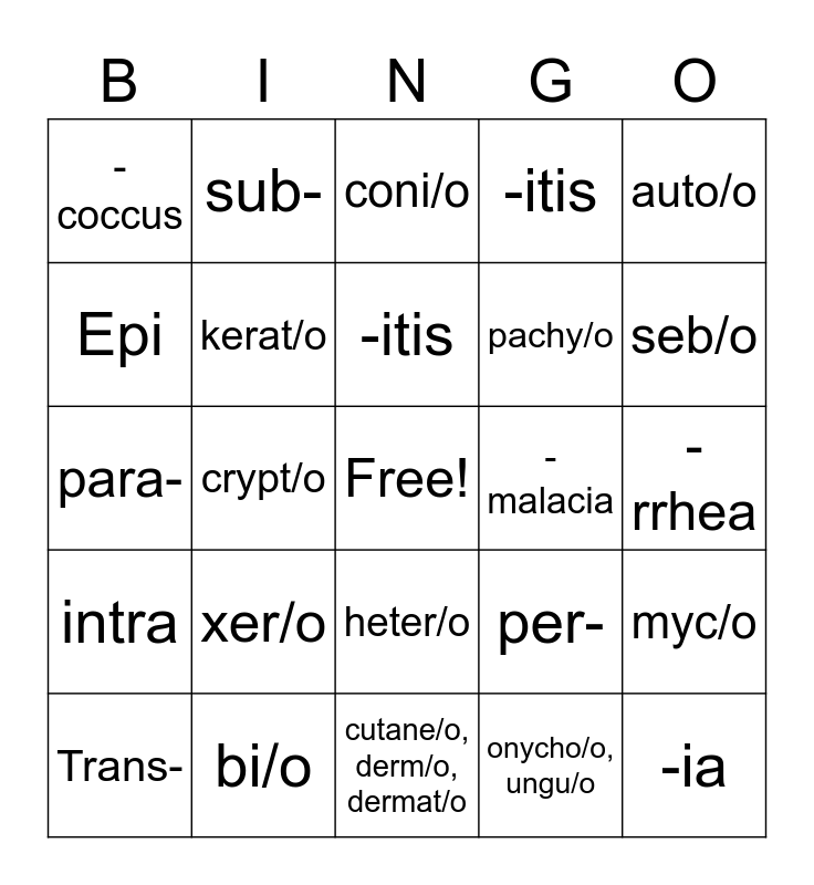 This bingo card has a free space and 24 words: xer/o, bi/o, -itis, Trans-, auto/o, -coccus, Epi, sub-, -malacia, heter/o, pachy/o, para-, per-, myc/o, kerat/o, onycho/o, ungu/o, -rrhea, coni/o, seb/o, crypt/o, -ia, intra, -itis and cutane/o, derm/o, dermat/o.