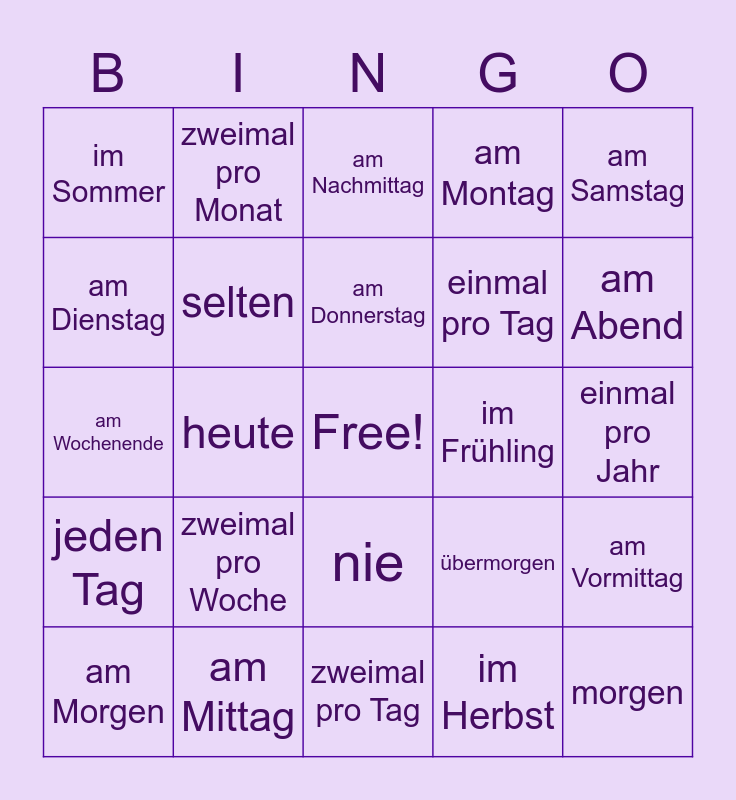This bingo card has a free space and 35 words: immer, oft, manchmal, selten, nie, am Montag, am Dienstag, am Mittwoch, am Donnerstag, am Freitag, am Wochenende, am Samstag, am Sonntag, im Winter, im Sommer, im Frühling, im Herbst, heute, jeden Tag, morgen, übermorgen, am Morgen, am Vormittag, am Mittag, am Nachmittag, am Abend, in der Nacht, einmal pro Woche, einmal pro Tag, einmal pro Jahr, einmal pro Monat, zweimal pro Tag, zweimal pro Woche, zweimal pro Monat and zweimal pro Jahr.