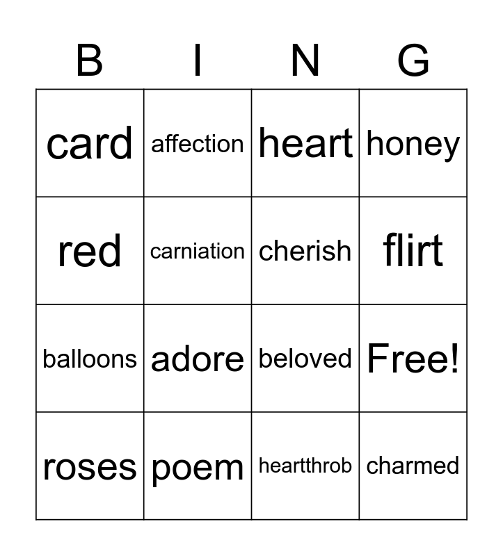 This bingo card has 20 words: Free!, love, heart, chocolate, roses, red, poem, card, balloons, affection, adore, beloved, carniation, charmed, cherish, flame, flirt, honey, heartthrob and dear.