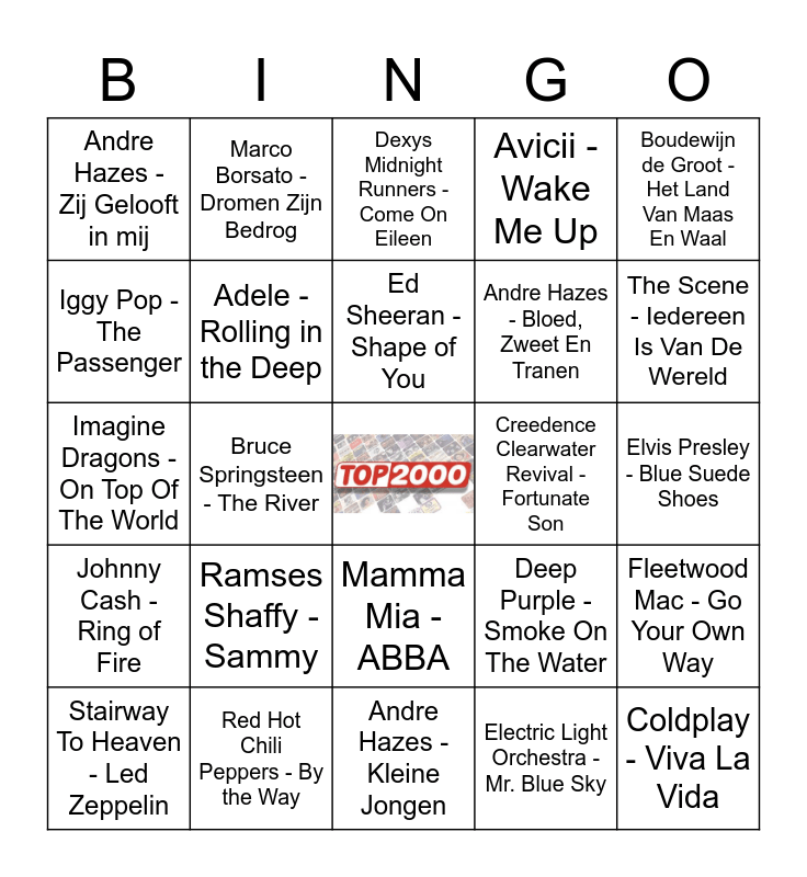 This bingo card has a free space and 55 words: Piano Man - Billy Joel, Stairway To Heaven - Led Zeppelin, Rollecoster - Danny Vera, Andre Hazes - Zij Gelooft in mij, Andre Hazes - Kleine Jongen, Youp van 't Hek - Flappie, Adele - Rolling in the Deep, A-ha - Take on Me, Andre Hazes - Bloed, Zweet En Tranen, Anouk - R U Kiddin' Me, Avicii - Wake Me Up, Bastille - Pompeii, Bee Gees - Stayin' Alive, Blur - Song 2, Bob Marley & The Wailers - Three Little Birds, Bon Jovi - It's My Life, Boudewijn de Groot - Het Land Van Maas En Waal, Bruce Springsteen - The River, Bryan Adams - Summer Of '69, Coldplay - Viva La Vida, Creedence Clearwater Revival - Fortunate Son, Cyndi Lauper - Girls Just Want to Have Fun, Deep Purple - Smoke On The Water, Dexys Midnight Runners - Come On Eileen, Doe Maar - Smoorverliefd, Ed Sheeran - Shape of You, Electric Light Orchestra - Mr. Blue Sky, Elton John - I'm Still Standing, Elvis Presley - Blue Suede Shoes, Fleetwood Mac - Go Your Own Way, George Ezra - Shotgun, Gigi D'Agostino - L'Amour Toujours, Haddaway - What Is Love, Herman Brood - Saturday Night, Iggy Pop - The Passenger, Imagine Dragons - On Top Of The World, John Lennon - Imagine, Johnny Cash - Ring of Fire, Lynyrd Skynyrd - Sweet Home Alabama, Madonna - Like a Virgin, Marco Borsato - Dromen Zijn Bedrog, Mumford & Sons - Little Lion Man, Oasis - Wonderwall, Queen - Bohemian Rhapsody, Ramses Shaffy - Sammy, Red Hot Chili Peppers - By the Way, The Beatles - Eleanor Rigby, The Proclaimers - I am Gonna Be, The Rolling Stones - Paint It, Black, The Scene - Iedereen Is Van De Wereld, Toto - Africa, Thunder - Imagine Dragons, We Are The Champions - Queen, Mamma Mia - ABBA and Dancing Queen - ABBA.