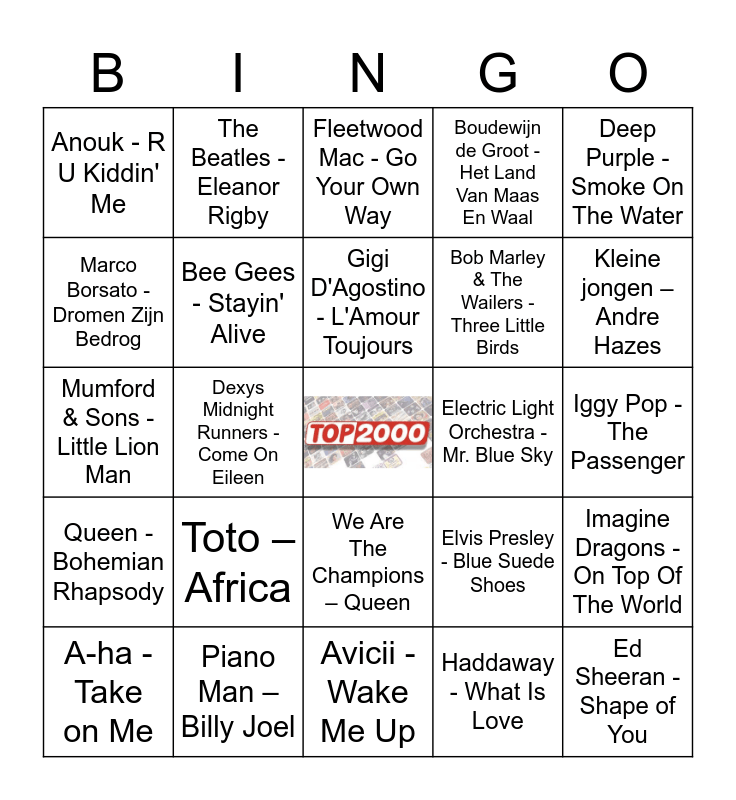 This bingo card has a free space and 55 words: Adele - Rolling in the Deep, A-ha - Take on Me, Andre Hazes - Bloed, Zweet En Tranen, Anouk - R U Kiddin' Me, Avicii - Wake Me Up, Bastille - Pompeii, Bee Gees - Stayin' Alive, Blur - Song 2, Bob Marley & The Wailers - Three Little Birds, Bon Jovi - It's My Life, Boudewijn de Groot - Het Land Van Maas En Waal, Bruce Springsteen - The River, Bryan Adams - Summer Of '69, Coldplay - Viva La Vida, Creedence Clearwater Revival - Fortunate Son, Cyndi Lauper - Girls Just Want to Have Fun, Deep Purple - Smoke On The Water, Dexys Midnight Runners - Come On Eileen, Doe Maar - Smoorverliefd, Ed Sheeran - Shape of You, Electric Light Orchestra - Mr. Blue Sky, Elton John - I'm Still Standing, Elvis Presley - Blue Suede Shoes, Fleetwood Mac - Go Your Own Way, George Ezra - Shotgun, Gigi D'Agostino - L'Amour Toujours, Haddaway - What Is Love, Herman Brood - Saturday Night, Iggy Pop - The Passenger, Imagine Dragons - On Top Of The World, John Lennon - Imagine, Johnny Cash - Ring of Fire, Lynyrd Skynyrd - Sweet Home Alabama, Madonna - Like a Virgin, Marco Borsato - Dromen Zijn Bedrog, Mumford & Sons - Little Lion Man, Oasis - Wonderwall, Queen - Bohemian Rhapsody, Ramses Shaffy - Sammy, Red Hot Chili Peppers - By the Way, The Beatles - Eleanor Rigby, The Proclaimers - I'm Gonna Be (500 Miles), The Rolling Stones - Paint It, Black, The Scene - Iedereen Is Van De Wereld, Toto – Africa, Piano Man – Billy Joel, Stairway To Heaven – Led Zeppelin, Rollecoster – Danny Vera, Zij gelooft in mij – Andre Hazes, Kleine jongen – Andre Hazes, Flappie – Youp van ‘t Hek, Dancing Queen – ABBA, Mamma Mia – ABBA, We Are The Champions – Queen and Thunder – Imagine Dragons.