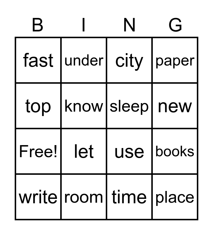 This bingo card has 20 words: books, good, city, help, write, top, room, fast, Free!, under, let, use, know, place, sleep, much, new, paper, time and name.