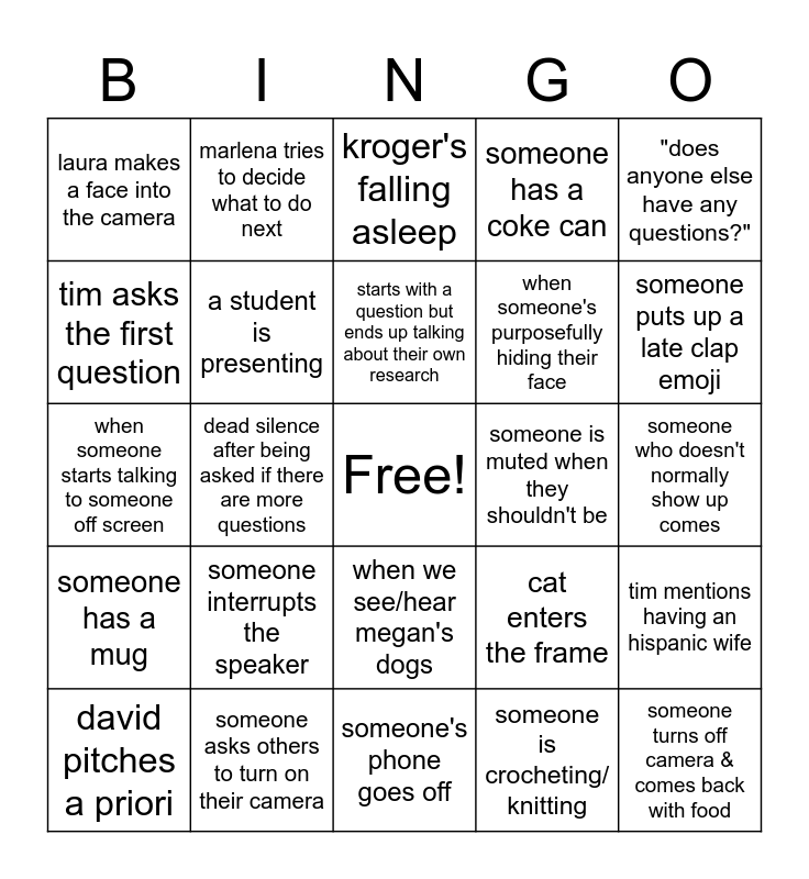 This bingo card has a free space and 24 words: someone interrupts the speaker, someone asks others to turn on their camera, starts with a question but ends up talking about their own research, david pitches a priori, "does anyone else have any questions?", laura makes a face into the camera, tim asks the first question, marlena tries to decide what to do next, someone is muted when they shouldn't be, when we see/hear megan's dogs, when someone's purposefully hiding their face, when someone starts talking to someone off screen, cat enters the frame, tim mentions having an hispanic wife, a student is presenting, someone is crocheting/ knitting, someone who doesn't normally show up comes, kroger's falling asleep, someone puts up a late clap emoji, dead silence after being asked if there are more questions, someone turns off camera & comes back with food, someone has a mug, someone has a coke can and someone's phone goes off.