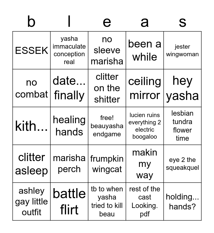 This bingo card has a free space and 33 words: clitter sauced, clown wigs on again, healing hands, spare wings?, clitter asleep, date... finally, jester wingwoman, ashley gay little outfit, yasha immaculate conception real, gay stutter, clitter on the shitter, no sleeve marisha, brjeaus talk, veth homophobic, lucien ruins everything 2 electric boogaloo, hey yasha, battle flirt, kith..., marisha perch, makin my way, frumpkin wingcat, fjorester w/ the steel chair, ESSEK, lesbian tundra flower time, tb to when yasha tried to kill beau, holding... hands?, been a while, ceiling mirror, no combat, eye 2 the squeakquel, "elements of", rest of the cast Looking. pdf and caduceus says smth profound and sexy.