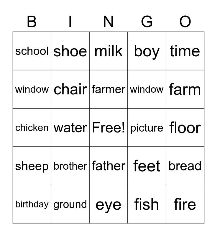 This bingo card has a free space and 24 words: brother, ground, farmer, birthday, time, school, window, shoe, picture, father, window, chicken, feet, bread, chair, fish, floor, milk, farm, water, fire, sheep, boy and eye.