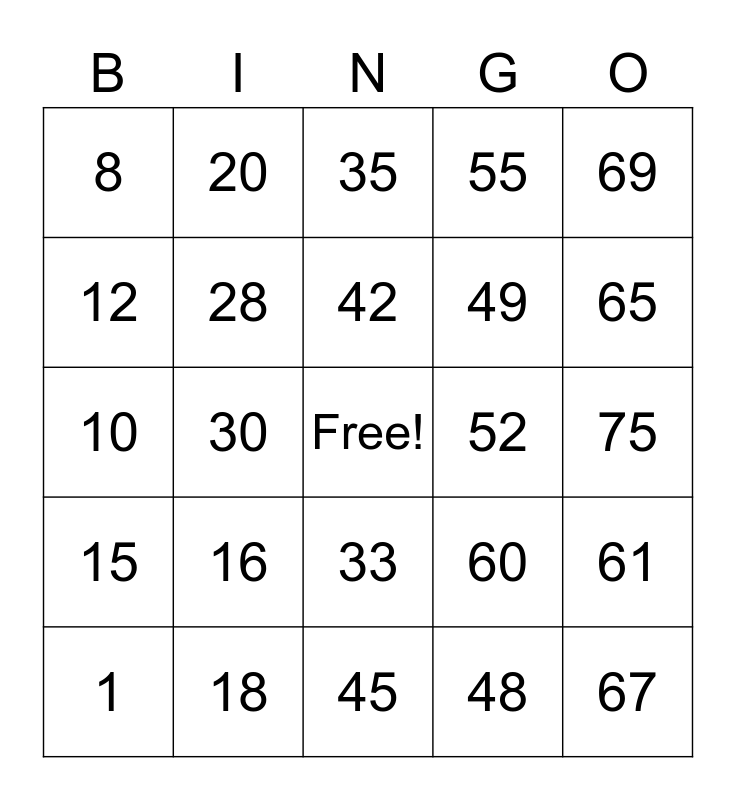 This bingo card has a free space and 24 words: 1, 16, 42, 48, 69, 8, 20, 35, 52, 75, 10, 28, 60, 61, 12, 18, 45, 55, 65, 15, 30, 33, 49 and 67.