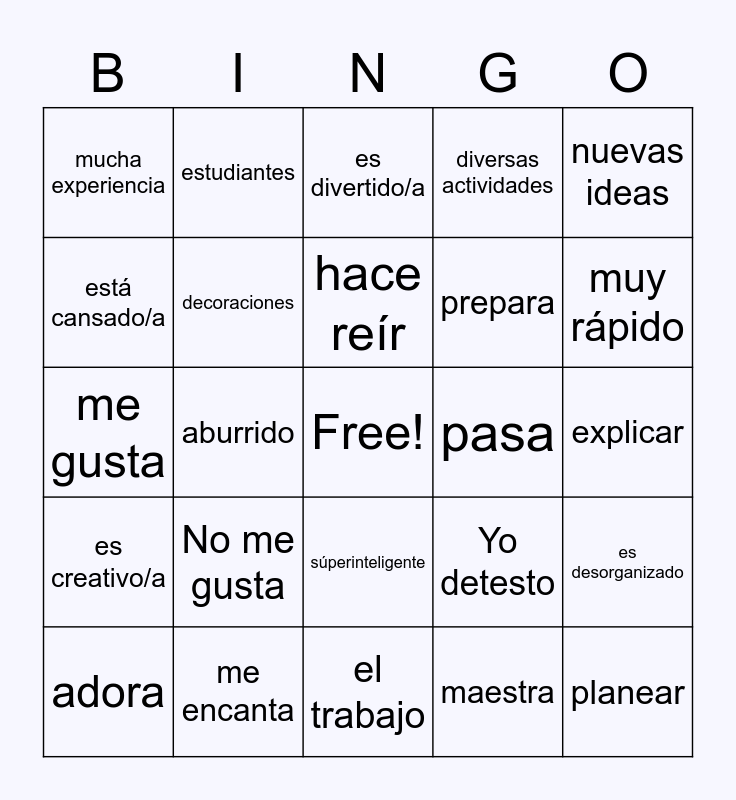 This bingo card has a free space and 34 words: maestro, maestra, tipos, la superastuta, es creativo/a, decoraciones, nuevas ideas, adora, estudiantes, la superdivertida, hace reír, es divertido/a, tiene energía, interesante, pasa, muy rápido, me encanta, me gusta, No me gusta, Yo detesto, súperinteligente, muy organizada, mucha experiencia, explicar, el trabajo, planear, diversas actividades, enseña, prepara, está cansado/a, No tiene energía, aburrido, es desorganizado and no explica.