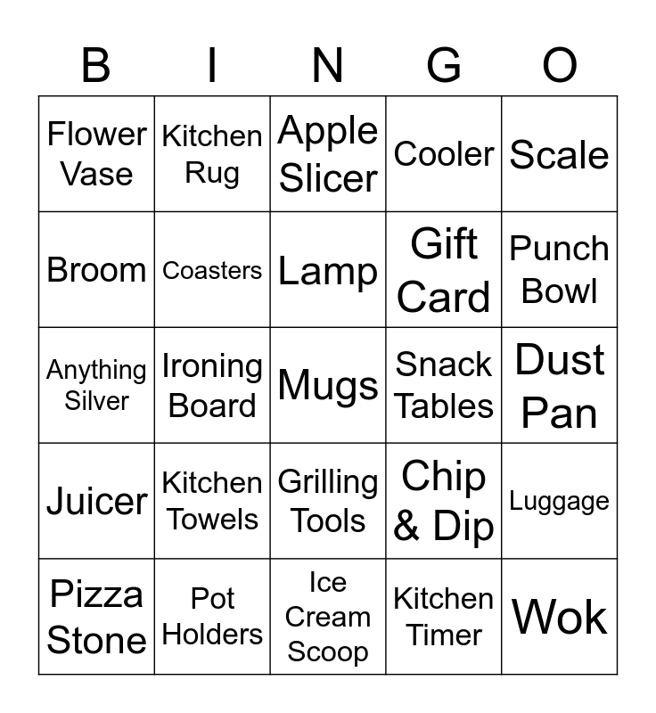 This bingo card has a free space and 24 words: Kitchen Towels, Pot Holders, Lamp, Pizza Stone, Scale, Flower Vase, Broom, Kitchen Rug, Snack Tables, Grilling Tools, Gift Card, Anything Silver, Chip & Dip, Luggage, Coasters, Kitchen Timer, Dust Pan, Apple Slicer, Punch Bowl, Ironing Board, Wok, Juicer, Cooler and Ice Cream Scoop.