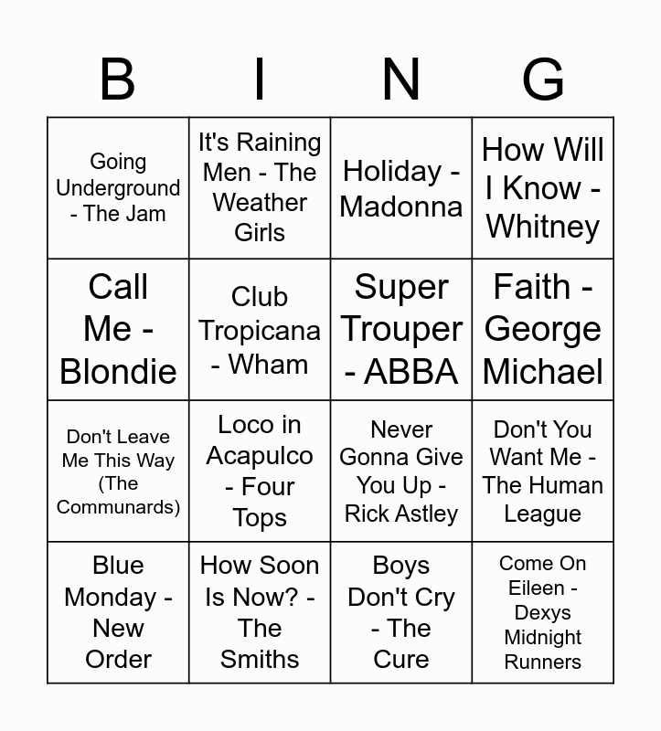 This bingo card has 35 words: Free!, The Only Way Is Up - Yazz, Careless Whisper - George Michael, Super Trouper - ABBA, Feels Like I'm In Love - Kelly Marie, How Will I Know - Whitney, Club Tropicana - Wham, Let's Dance - David Bowie, Faith - George Michael, Funky Town - Lipps Inc, Never Gonna Give You Up - Rick Astley, Call Me - Blondie, True - Spandau Ballet, Ghost Town - The Specials, Going Underground - The Jam, How Soon Is Now? - The Smiths, Town Called Malice - The Jam, Don't You Want Me - The Human League, Come On Eileen - Dexys Midnight Runners, Blue Monday - New Order, Sweet Child O' Mine - Guns N' Roses, Everywhere - Fleetwood Mac, The Best - Tina Turner, I Think We're Alone Now - Tiffany, Holiday - Madonna, Loco in Acapulco - Four Tops, A Little Respect - Erasure, You Make My Dreams (Come True) - Daryl Hall & John Oates, Don't Leave Me This Way (The Communards), Boys Don't Cry - The Cure, Karma Chameleon - Culture Club, The Power Of Love - Huey Lewis & The News, Crazy Little Thing Called Love - Queen, It's Raining Men - The Weather Girls and I'm Coming Out - Diana Ross.
