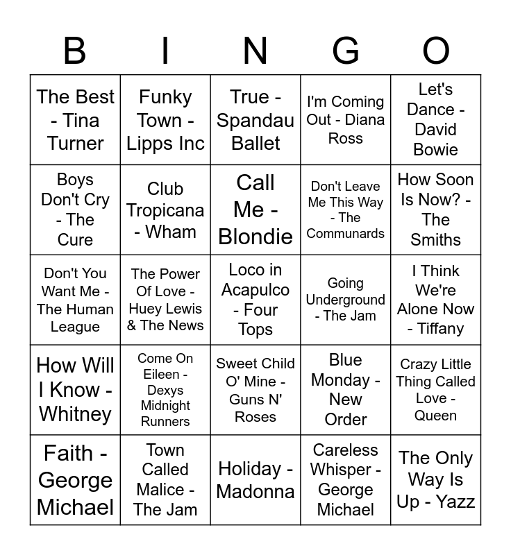This bingo card has 34 words: The Only Way Is Up - Yazz, Careless Whisper - George Michael, Super Trouper - ABBA, Feels Like I'm In Love - Kelly Marie, How Will I Know - Whitney, Club Tropicana - Wham, Let's Dance - David Bowie, Faith - George Michael, Funky Town - Lipps Inc, Never Gonna Give You Up - Rick Astley, Call Me - Blondie, True - Spandau Ballet, A Little Respect - Erasure, Ghost Town - The Specials, Going Underground - The Jam, How Soon Is Now? - The Smiths, Town Called Malice - The Jam, Don't You Want Me - The Human League, Come On Eileen - Dexys Midnight Runners, Blue Monday - New Order, Sweet Child O' Mine - Guns N' Roses, Everywhere - Fleetwood Mac, The Best - Tina Turner, I Think We're Alone Now - Tiffany, Holiday - Madonna, Loco in Acapulco - Four Tops, I'm Coming Out - Diana Ross, You Make My Dreams (Come True) - Daryl Hall & John Oates, Don't Leave Me This Way - The Communards, Boys Don't Cry - The Cure, Karma Chameleon - Culture Club, The Power Of Love - Huey Lewis & The News, Crazy Little Thing Called Love - Queen and It's Raining Men - The Weather Girls.