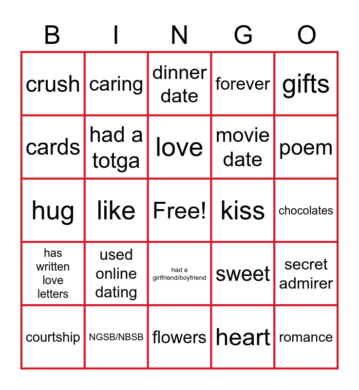 This bingo card has a free space and 24 words: used online dating, NGSB/NBSB, love, courtship, gifts, crush, cards, caring, kiss, had a girlfriend/boyfriend, movie date, hug, sweet, secret admirer, had a totga, heart, chocolates, dinner date, poem, like, romance, has written love letters, forever and flowers.