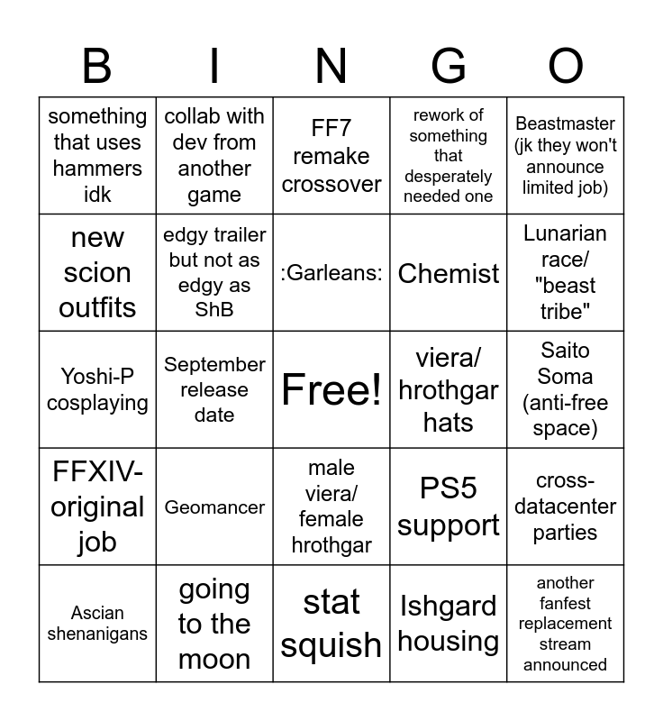 This bingo card has a free space and 24 words: Geomancer, going to the moon, :Garleans:, Ascian shenanigans, Beastmaster (jk they won't announce limited job), something that uses hammers idk, new scion outfits, collab with dev from another game, viera/ hrothgar hats, male viera/ female hrothgar, Chemist, Yoshi-P cosplaying, PS5 support, cross-datacenter parties, edgy trailer but not as edgy as ShB, Ishgard housing, Saito Soma (anti-free space), FF7 remake crossover, Lunarian race/ "beast tribe", September release date, another fanfest replacement stream announced, FFXIV-original job, rework of something that desperately needed one and stat squish.
