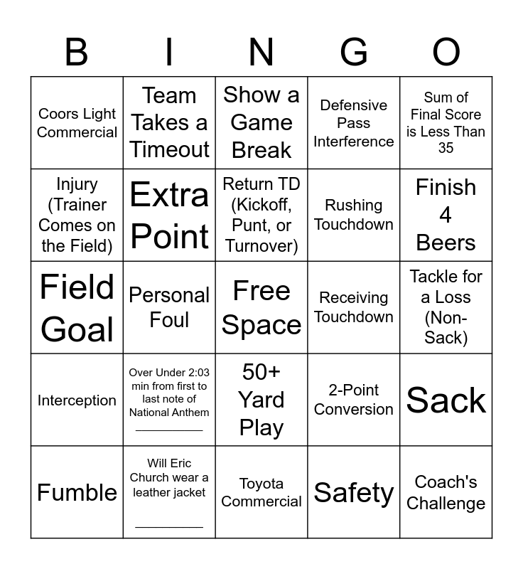 This bingo card has a free space and 24 words: Over Under 2:03 min from first to last note of National Anthem ___________, Will Eric Church wear a leather jacket __________, Return TD (Kickoff, Punt, or Turnover), Fumble, Sum of Final Score is Less Than 35, Coors Light Commercial, Injury (Trainer Comes on the Field), Team Takes a Timeout, Receiving Touchdown, 50+ Yard Play, Rushing Touchdown, Field Goal, 2-Point Conversion, Sack, Extra Point, Safety, Tackle for a Loss (Non-Sack), Show a Game Break, Finish 4 Beers, Personal Foul, Coach's Challenge, Interception, Defensive Pass Interference and Toyota Commercial.