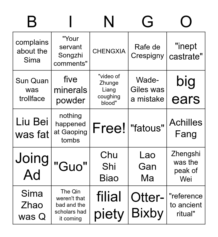 This bingo card has a free space and 24 words: "Guo", The Qin weren't that bad and the scholars had it coming, "video of Zhunge Liang coughing blood", Sima Zhao was Q, "inept castrate", complains about the Sima, Sun Quan was trollface, "Your servant Songzhi comments", "fatous", Chu Shi Biao, Wade-Giles was a mistake, Liu Bei was fat, Lao Gan Ma, Zhengshi was the peak of Wei, five minerals powder, Otter-Bixby, Achilles Fang, CHENGXIA, big ears, nothing happened at Gaoping tombs, "reference to ancient ritual", Joing Ad, Rafe de Crespigny and filial piety.