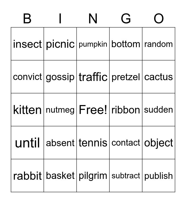 This bingo card has a free space and 24 words: absent, basket, traffic, rabbit, random, insect, convict, picnic, ribbon, tennis, pretzel, kitten, contact, object, gossip, subtract, sudden, pumpkin, cactus, nutmeg, publish, until, bottom and pilgrim.