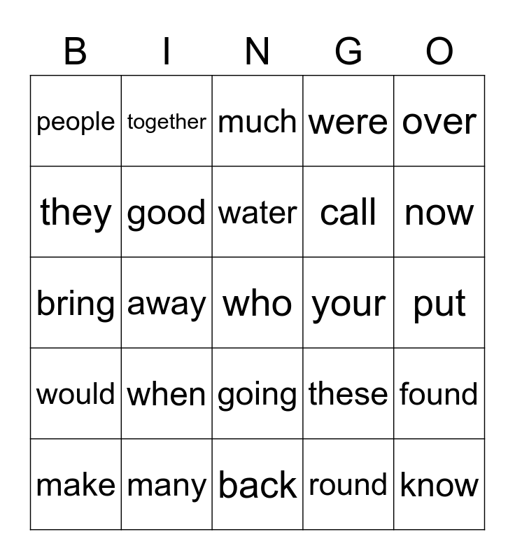 This bingo card has a free space and 39 words: word, does, how, good, make, going, water, where, over, would, away, were, know, put, your, when, goes, people, what, these, they, back, call, now, because, warm, about, done, later, together, hold, laugh, much, many, round, why, found, bring and has.