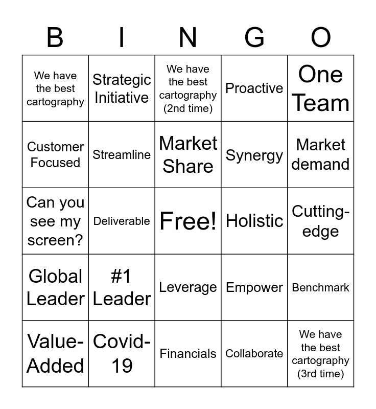 This bingo card has a free space and 24 words: #1 Leader, Covid-19, Market Share, Value-Added, One Team, We have the best cartography, Customer Focused, Strategic Initiative, Holistic, Leverage, Synergy, Can you see my screen?, Empower, Benchmark, Streamline, Collaborate, Cutting-edge, We have the best cartography (2nd time), Market demand, Deliverable, We have the best cartography (3rd time), Global Leader, Proactive and Financials.