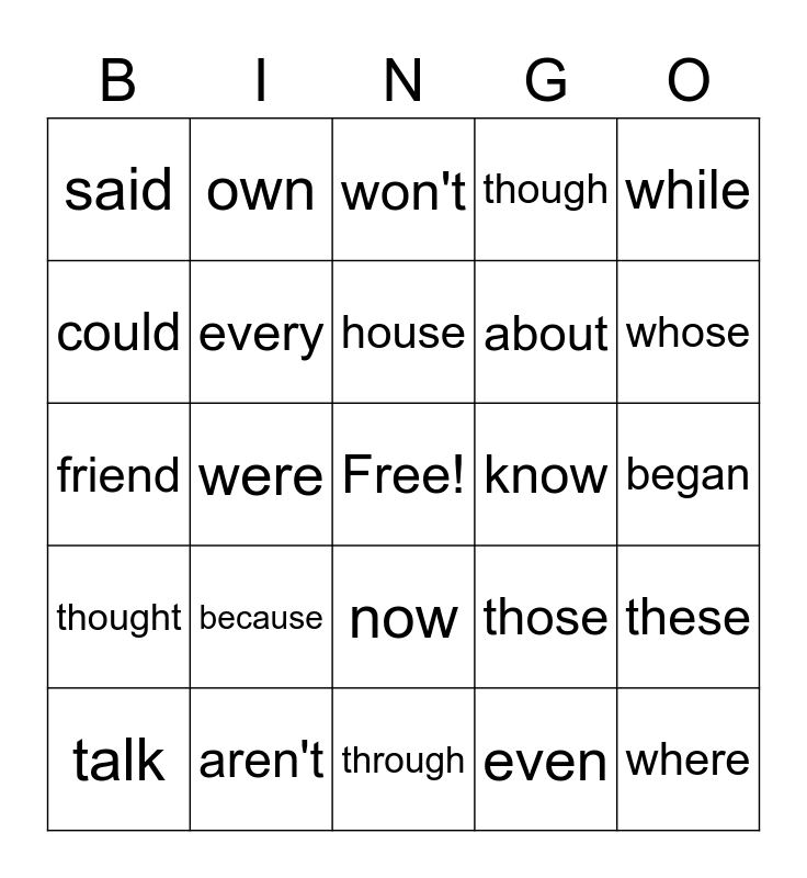 This bingo card has a free space and 24 words: because, aren't, house, talk, while, said, could, own, know, now, about, friend, those, these, every, even, began, won't, whose, were, where, thought, though and through.