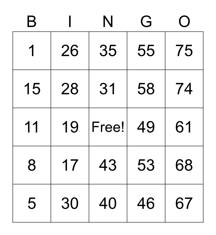 This bingo card has a free space and 24 words: 5, 17, 31, 46, 75, 1, 26, 35, 49, 61, 11, 28, 53, 68, 15, 30, 40, 55, 74, 8, 19, 43, 58 and 67.