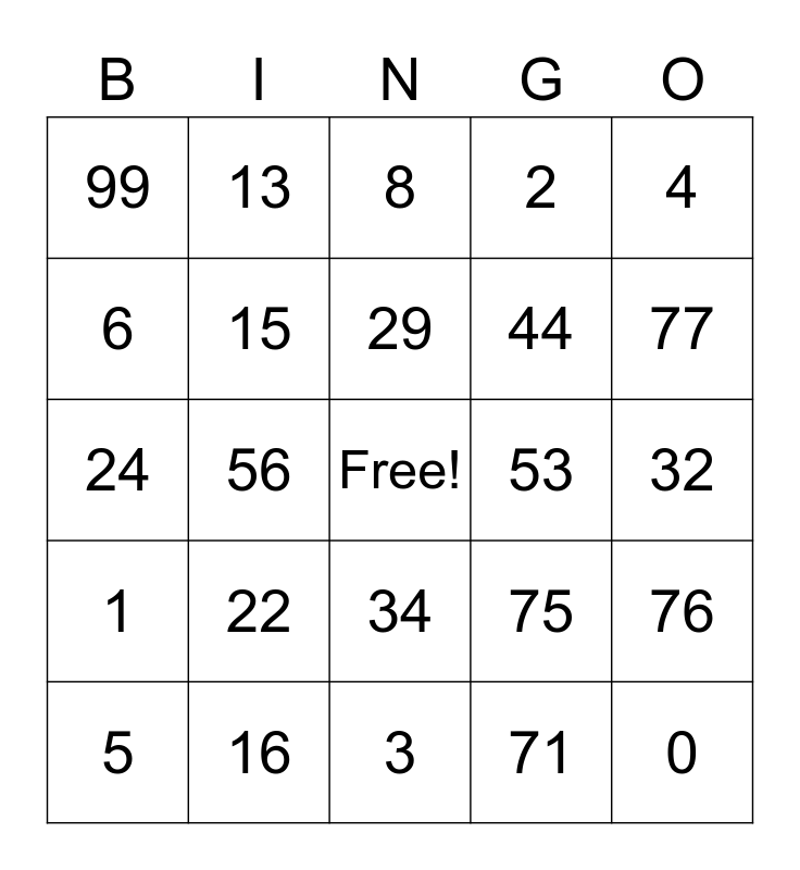 This bingo card has a free space and 24 words: 22, 16, 29, 5, 4, 99, 6, 13, 53, 34, 44, 24, 75, 76, 15, 71, 32, 8, 77, 56, 0, 1, 2 and 3.