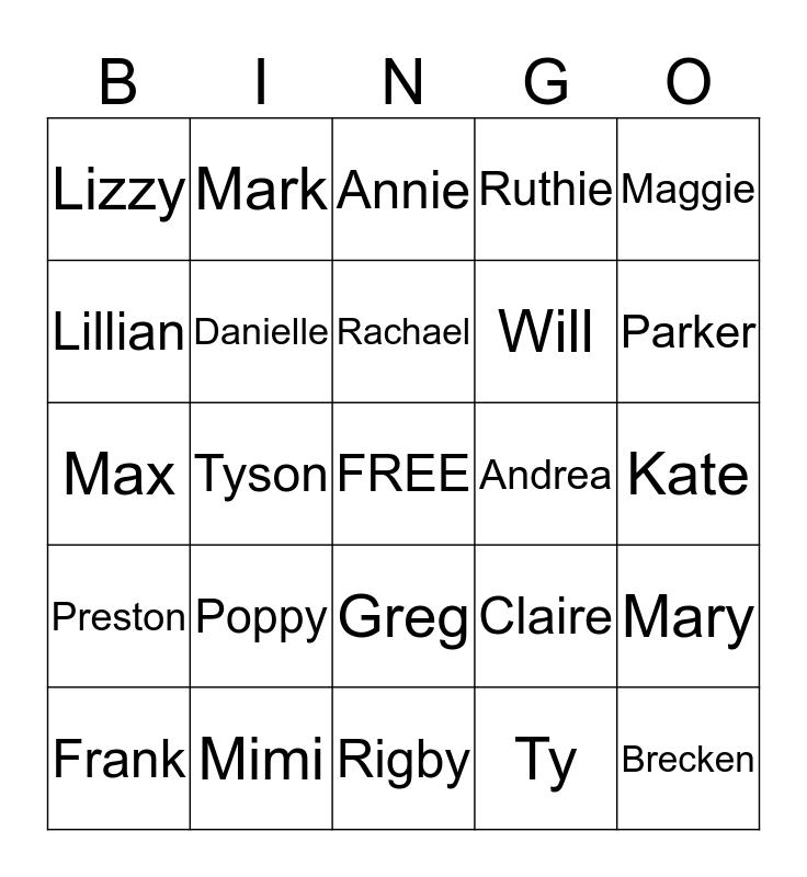 This bingo card has a free space and 24 words: Poppy, Mimi, Rachael, Frank, Maggie, Lizzy, Lillian, Mark, Andrea, Greg, Will, Max, Claire, Mary, Danielle, Ty, Kate, Annie, Parker, Tyson, Brecken, Preston, Ruthie and Rigby.