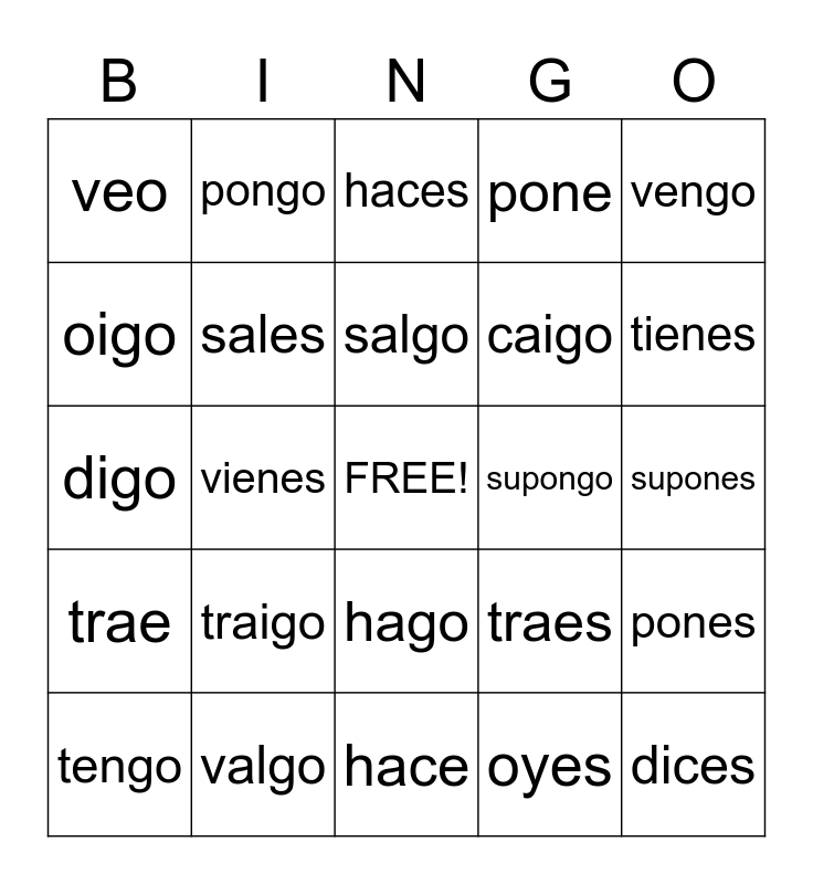 This bingo card has a free space and 24 words: traigo, valgo, salgo, tengo, vengo, veo, oigo, pongo, supongo, hago, caigo, digo, traes, pones, sales, oyes, supones, haces, tienes, vienes, dices, trae, pone and hace.