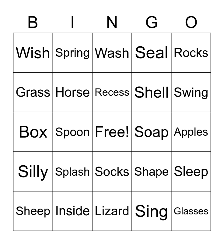 This bingo card has a free space and 24 words: Splash, Inside, Recess, Sheep, Rocks, Wish, Grass, Spring, Soap, Socks, Shell, Box, Shape, Sleep, Horse, Sing, Apples, Wash, Swing, Spoon, Glasses, Silly, Seal and Lizard.