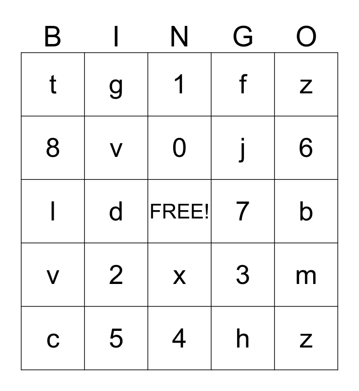 This bingo card has a free space and 24 words: 2, 5, 0, c, z, t, 8, g, 7, x, j, l, 3, m, v, h, b, 1, 6, d, z, v, f and 4.