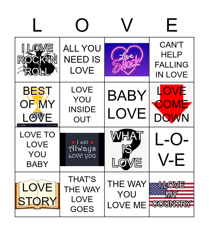 This bingo card has 12 images and 22 words: LOVE ME TENDER, LOVE IS A BATTLEFIELD, LOVE COME DOWN, ENDLESS LOVE, BEST OF MY LOVE, I LOVE ROCK 'N ROLL, LOVE YOU INSIDE OUT, ALL YOU NEED IS LOVE, THAT'S THE WAY LOVE GOES, STOP IN THE NAME OF LOVE, LOVE TO LOVE YOU BABY, WHAT IS LOVE, NOW THAT WE FOUND LOVE, LOVE SONG, BABY LOVE, WORDS OF LOVE, THE WAY YOU LOVE ME, L-O- V-E, LOVE STORY, I LOVE MY COUNTRY, CAN'T HELP FALLING IN LOVE and YOU GIVE LOVE A BAD NAME.