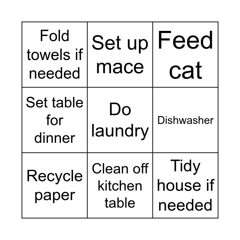 This bingo card has a free space and 8 words: Dishwasher, Feed cat, Set up mace, Recycle paper, Fold towels if needed, Tidy house if needed, Set table for dinner and Clean off kitchen table.