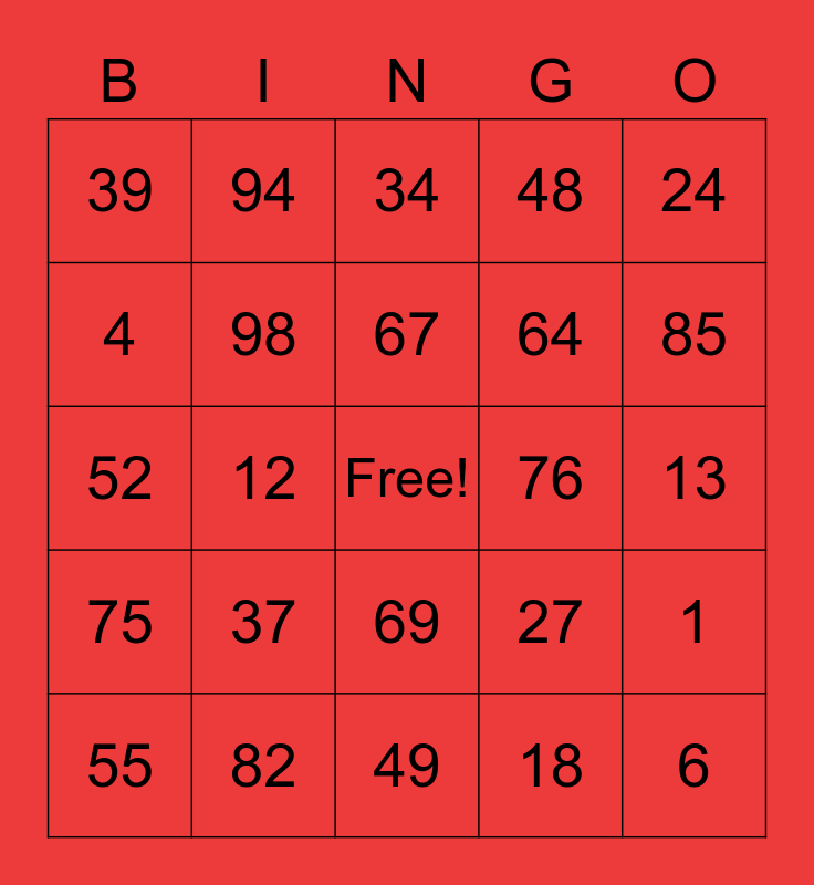 This bingo card has a free space and 24 words: 37, 82, 67, 55, 24, 39, 4, 94, 76, 69, 64, 52, 27, 1, 98, 18, 13, 34, 85, 12, 6, 75, 48 and 49.