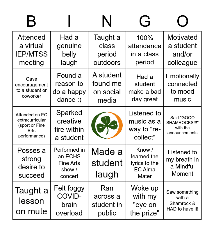 This bingo card has a free space and 24 words: Performed in an ECHS Fine Arts show / concert, Felt foggy COVID-brain overload, A student found me on social media, Taught a lesson on mute, Motivated a student and/or colleague, Attended a virtual IEP/MTSS meeting, Gave encouragement to a student or coworker, Had a genuine belly laugh, Listened to music as a way to "re-collect", Made a student laugh, Had a student make a bad day great, Attended an EC extracurricular (sport or Fine Arts performance), Know / learned the lyrics to the EC Alma Mater, Listened to my breath in a Mindful Moment, Found a reason to do a happy dance :), Woke up with my "eye on the prize", Said "GOOO SHAMROCKS!!!" with the announcements, Taught a class period outdoors, Emotionally connected to mood music, Sparked creative fire within a student, Saw something with a Shamrock & HAD to have it!, Posses a strong desire to succeed, 100% attendance in a class period and Ran across a student in public.