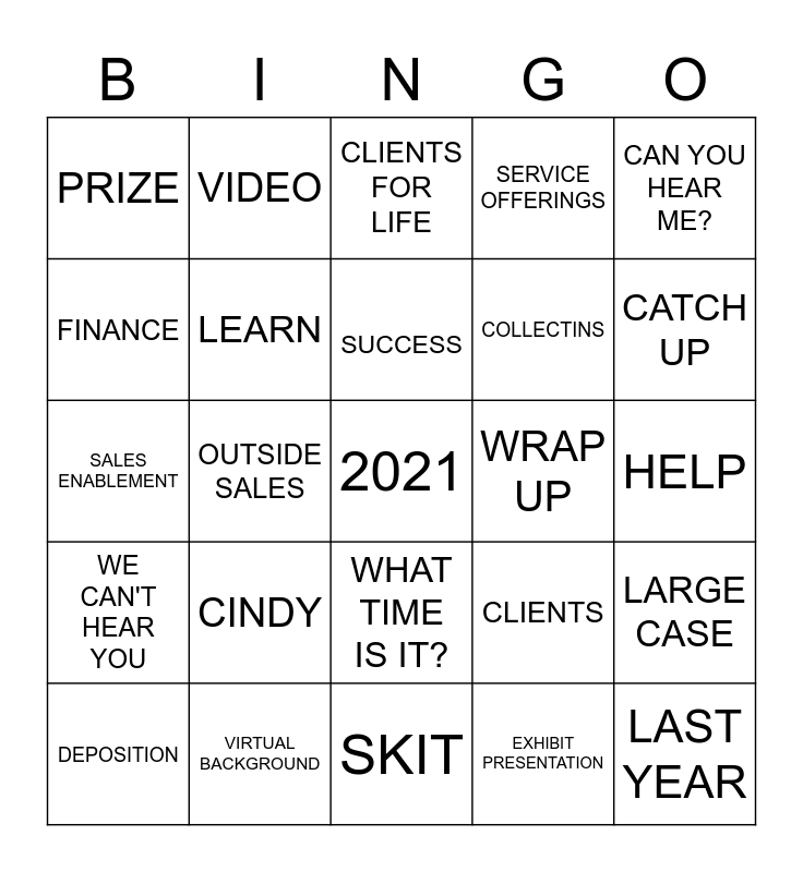 This bingo card has a free space and 24 words: CINDY, VIRTUAL BACKGROUND, SUCCESS, DEPOSITION, CAN YOU HEAR ME?, PRIZE, FINANCE, VIDEO, WRAP UP, WHAT TIME IS IT?, COLLECTINS, SALES ENABLEMENT, CLIENTS, LARGE CASE, LEARN, EXHIBIT PRESENTATION, HELP, CLIENTS FOR LIFE, CATCH UP, OUTSIDE SALES, LAST YEAR, WE CAN'T HEAR YOU, SERVICE OFFERINGS and SKIT.