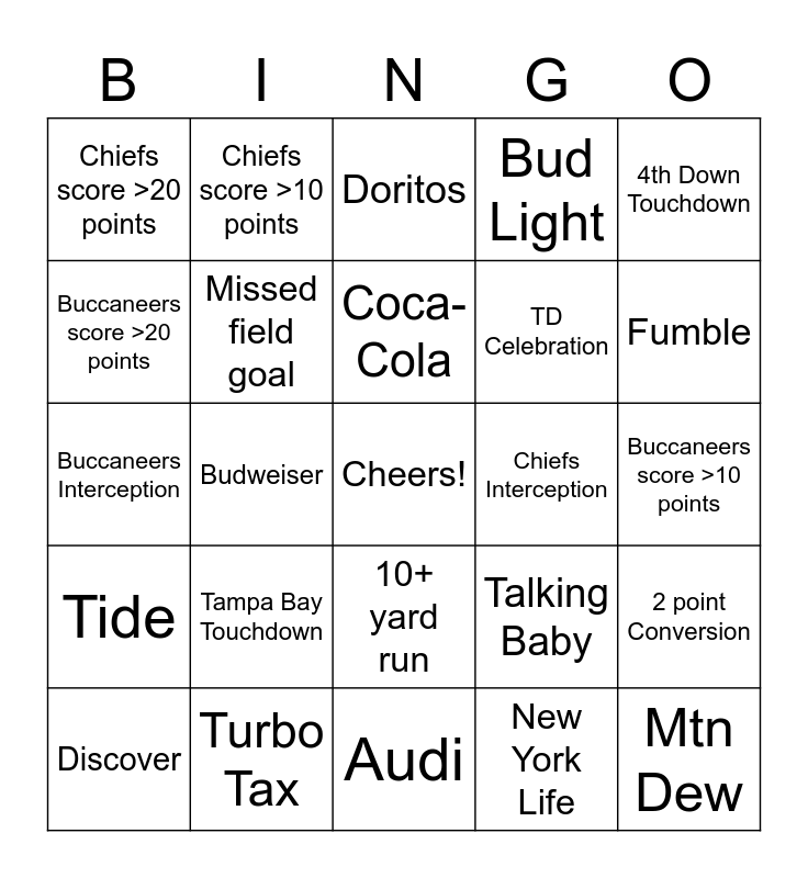 This bingo card has a free space and 33 words: QB Sack, Challenge Flag, Budweiser, 30+ yard Field goal, Tide, Missed field goal, 4th Down Touchdown, Discover, Chiefs score >10 points, 20+ yard pass, Coca-Cola, Doritos, KC Touchdown, Verizon, Chiefs Interception, Fumble, Turbo Tax, Buccaneers Interception, Tampa Bay Touchdown, Talking Baby, 10+ yard run, Mila & Ashton, Chiefs score >20 points, Buccaneers score >10 points, Audi, Mtn Dew, Bud Light, TD Celebration, Buccaneers score >20 points, 2 point Conversion, Hyundai, New York Life and Snickers.