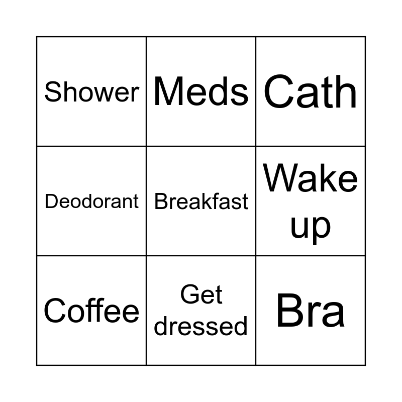 This bingo card has a free space and 8 words: Wake up, Cath, Meds, Coffee, Shower, Bra, Deodorant and Get dressed.