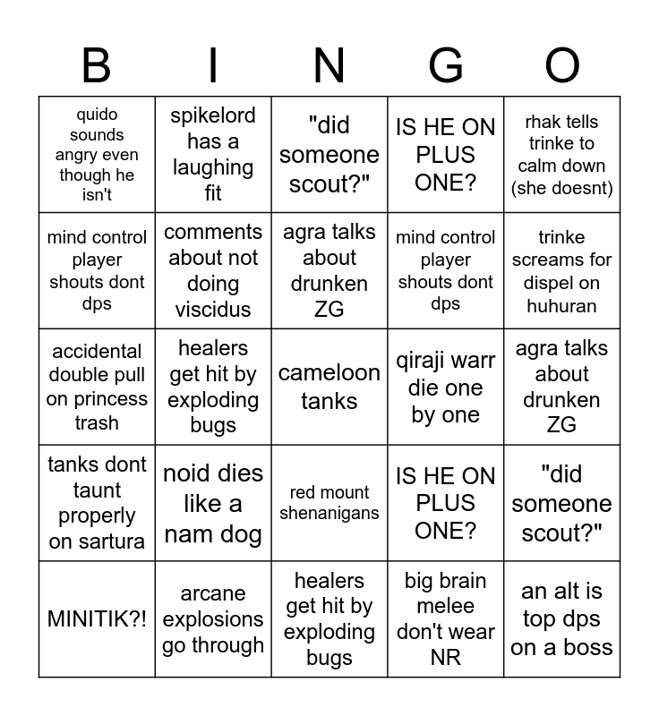 This bingo card has a free space and 118 words: DRINK BREAK?!, lammy says "thats what she said!", death looting a boss, agra talks loudly about nothing, swualla overaggros, rhak talks down to everyone, IS HE ON PLUS ONE?, big brain melee don't wear NR, mind control player shouts dont dps, someone tries to bait a bingo, tanks complain about cthun assignment, blaming the healers, qiraji warr die one by one, rhak says meaningless encouraging things, "speed run?", trinke yells "OWO?!", red mount shenanigans, rhak tells trinke to calm down (she doesnt), agra clinks his glass, rhak says "alright lads", MINITIK?!, "did someone scout?", people don't watch their angles, melee camp takes a sand blast, target that rhak doesn't call dies first, tanks dont taunt properly on sartura, arcane explosions go through, rhak talks constantly in the gauntlet for no reason, comments about not doing viscidus, accidental double pull on princess trash, trinke screams for dispel on huhuran, agra talks about drunken ZG, healers get hit by exploding bugs, warrior dies so many times on trash they dont have to tank anymore, "REPAIR BOOT?", sunder armour falls off on a boss, spikelord has a laughing fit, an alt is top dps on a boss, noid dies like a nam dog, quido sounds angry even though he isn't, DRINK BREAK?!, lammy says "thats what she said!", death looting a boss, agra talks loudly about nothing, rhak talks down to everyone, IS HE ON PLUS ONE?, big brain melee don't wear NR, mind control player shouts dont dps, someone tries to bait a bingo, tanks complain about cthun assignment, blaming the healers, qiraji warr die one by one, rhak says meaningless encouraging things, "speed run?", trinke yells "OWO?!", red mount shenanigans, rhak tells trinke to calm down (she doesnt), agra clinks his glass, rhak says "alright lads", MINITIK?!, "did someone scout?", people don't watch their angles, melee camp takes a sand blast, target that rhak doesn't call dies first, tanks dont taunt properly on sartura, arcane explosions go through, rhak talks constantly in the gauntlet for no reason, comments about not doing viscidus, accidental double pull on princess trash, trinke screams for dispel on huhuran, agra talks about drunken ZG, healers get hit by exploding bugs, warrior dies so many times on trash they dont have to tank anymore, "REPAIR BOOT?", sunder armour falls off on a boss, spikelord has a laughing fit, an alt is top dps on a boss, noid dies like a nam dog, quido sounds angry even though he isn't, DRINK BREAK?!, lammy says "thats what she said!", death looting a boss, agra talks loudly about nothing, rhak talks down to everyone, IS HE ON PLUS ONE?, big brain melee don't wear NR, mind control player shouts dont dps, someone tries to bait a bingo, tanks complain about cthun assignment, blaming the healers, qiraji warr die one by one, rhak says meaningless encouraging things, "speed run?", trinke yells "OWO?!", red mount shenanigans, rhak tells trinke to calm down (she doesnt), agra clinks his glass, rhak says "alright lads", MINITIK?!, "did someone scout?", people don't watch their angles, melee camp takes a sand blast, target that rhak doesn't call dies first, tanks dont taunt properly on sartura, arcane explosions go through, rhak talks constantly in the gauntlet for no reason, comments about not doing viscidus, accidental double pull on princess trash, trinke screams for dispel on huhuran, agra talks about drunken ZG, healers get hit by exploding bugs, warrior dies so many times on trash they dont have to tank anymore, "REPAIR BOOT?", sunder armour falls off on a boss, spikelord has a laughing fit, an alt is top dps on a boss, noid dies like a nam dog and quido sounds angry even though he isn't.